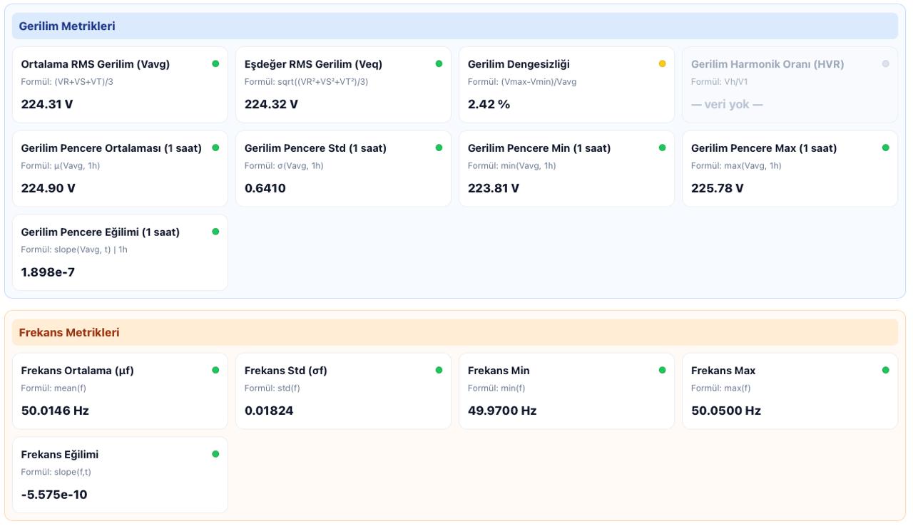 Şebeke gerilimiFaz-faz / faz-nötr gerilimleri, gerilim seviyesi, gerilim sapmalarıDüşük gerilim, yüksek gerilim, dengesizlik, kritik besleme uyarısıEnerji kalitesi görünürlüğü, arıza öncesi risk farkındalığı