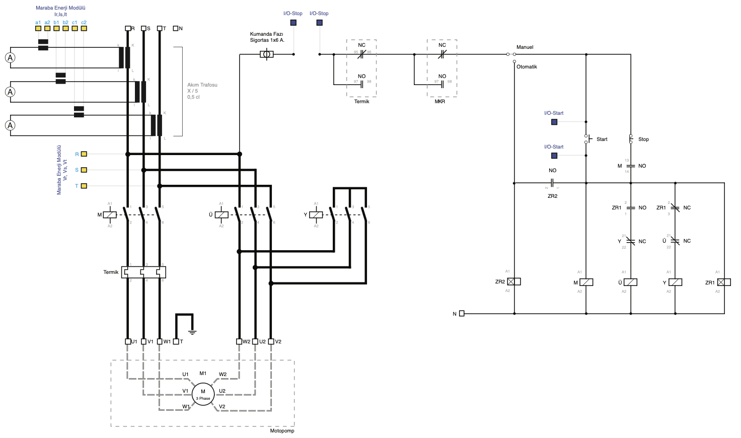 Bu sayfayı okurken iki katmanı ayrı düşün: Güç devresi (motora giden enerji yolu) ve kontrol/otomasyon devresi (kontaktör bobinleri, röleler).