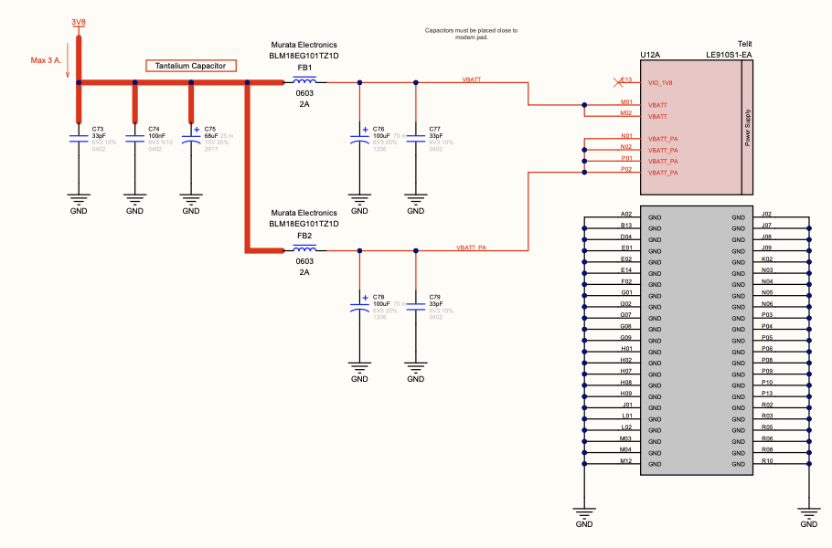 Bu blok, 5V rayından modem için 3V8 üreten LT1528 LDO + VBATT/VBATT_PA ayrıştırma filtrelerinden oluşur. Tasarımın başarısını belirleyen 3 kritik nokta: