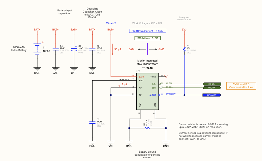 B107AA’da batarya durumunu (doluluk/gerilim/akım) sahada “tahmine” bırakmamak için MAX17055 fuel gauge kullanılmıştır. Bu entegre; 1S Li‑ion/LiPo bataryanın gerilimini izler, batarya akımını şönt direnç üzerinden ölçer ve I2C üzerinden MCU’ya raporlar.