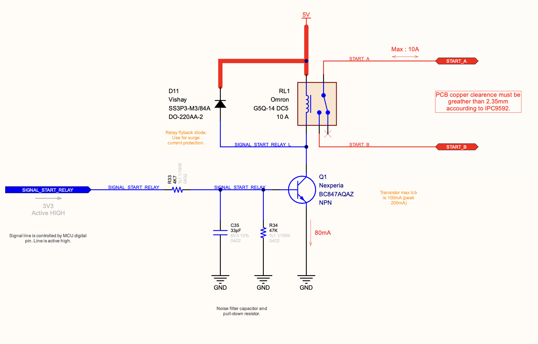 • MCU SIGNAL_START_RELAY hattını HIGH yaptığında, R32 (680Ω) üzerinden Q1 bazına akım akar ve Q1 satürasyona yaklaşarak bobini GND’ye çeker.