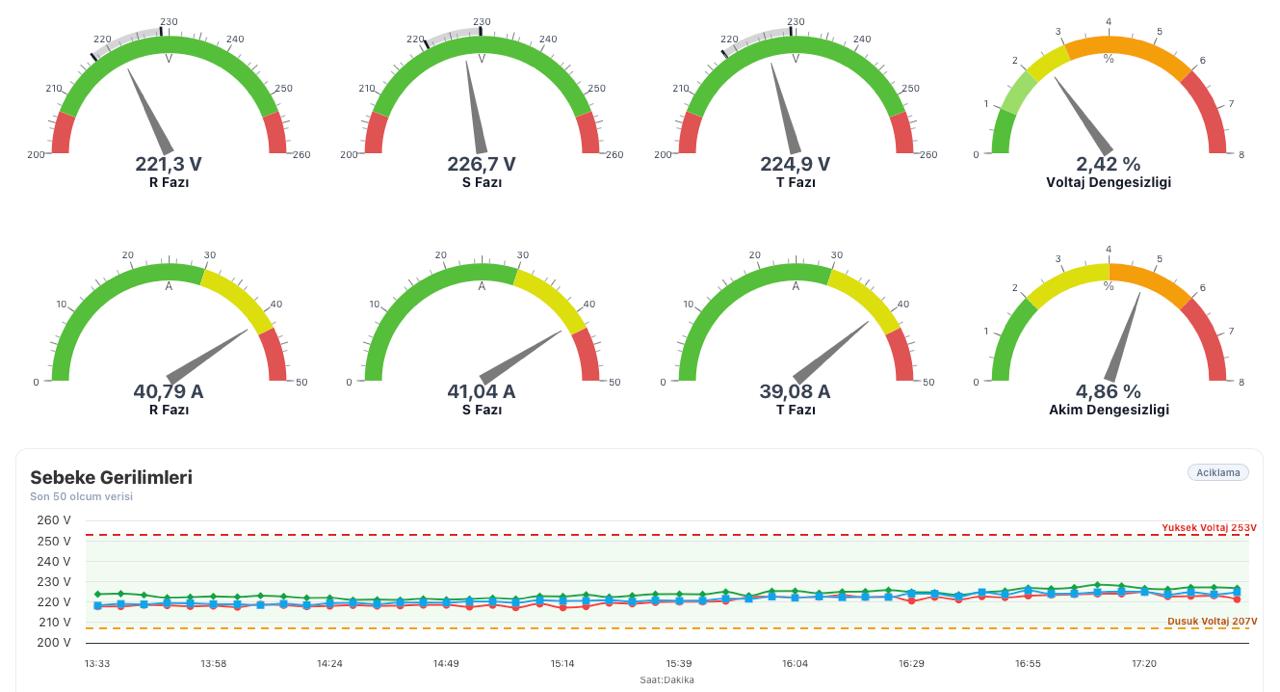 | Şebeke gerilimi | Faz-faz / faz-nötr gerilimleri, gerilim seviyesi, gerilim sapmaları | Düşük gerilim, yüksek gerilim, dengesizlik, kritik besleme uyarısı | Enerji kalitesi görünürlüğü, arıza öncesi risk farkındalığı |